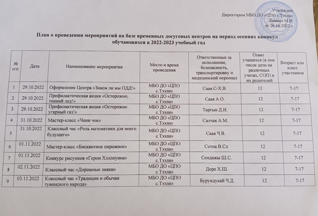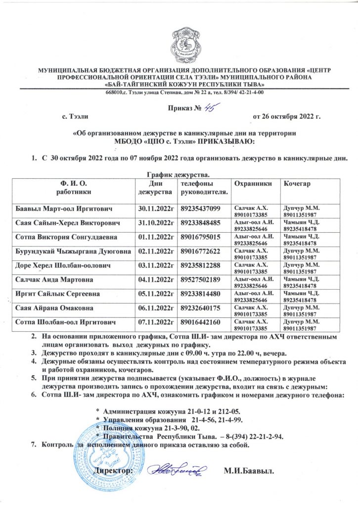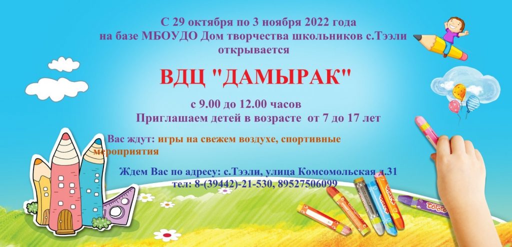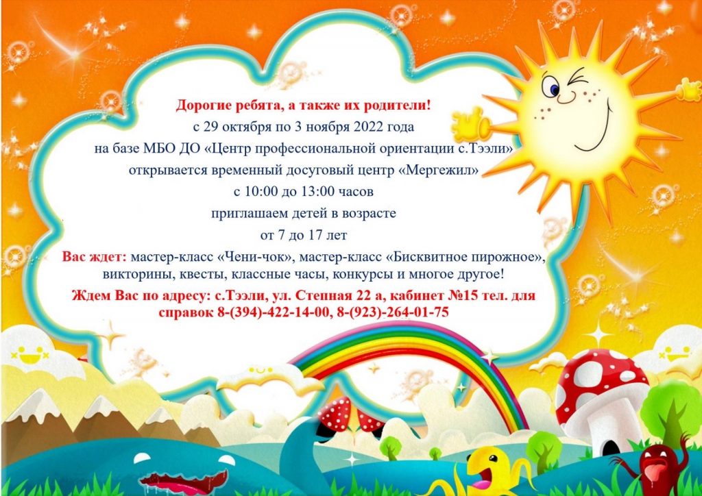 ВДЦ Временно досуговые центры (ВДЦ). 31.10.2022 / МБДОУ ДО ДТШ ВДЦ «Дамырак» план мероприятий. План мероприятийСкачать 2. Центр профессиональной ориентации с.Тээли «Мергежил» План мероприятий и график дежурства центра профессиональной ориентации с.Тээли «Мергежил»