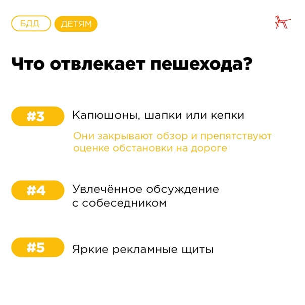 ⚡ 5 факторов, которые отвлекают внимание пешеходов Дорожное движение — это сложный процесс, который зависит от большого количества факторов и каждого участника движения: и водителя, и пешехода. Чтобы пешеходу оставаться в безопасности нужно оставаться внимательным вблизи проезжей части дороги и при её переходе. Центр по профилактике ДДТТ Института воспитания подготовил карточки, где собраны основные факторы, отвлекающие внимание пешеходов.