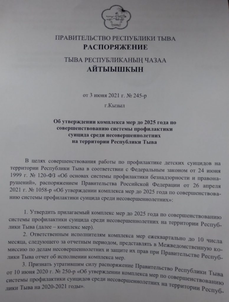 -«Межведомственный комплекс дополнительных мер по развитию системы безнадзорности и правонарушений несовершеннолетних в РТ на 2021-2022 годы» утвержден Постановлением МКДН И ЗП МКДН И ЗП при Правительстве Республики Тыва № 12-мкдн от 20 августа 2020 года