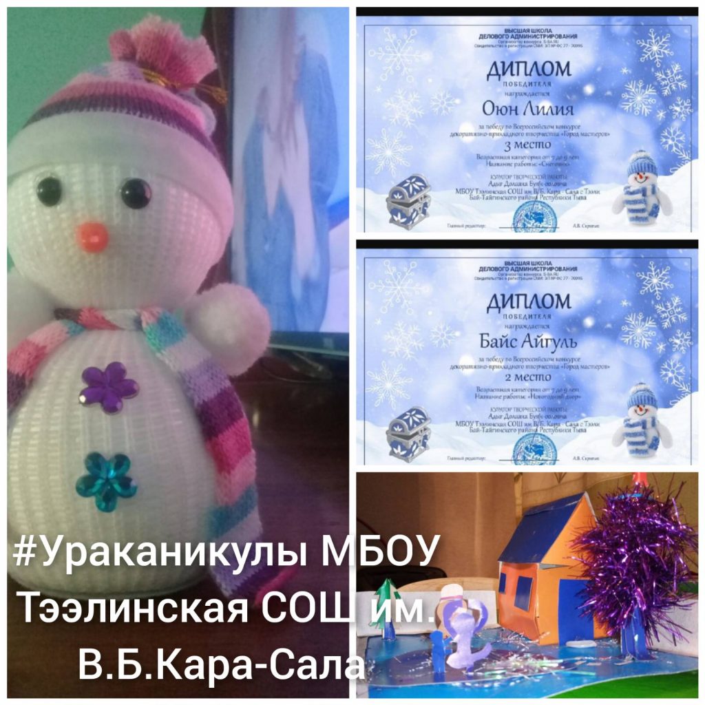 Учащиеся 3 «в» класса Тээлинской средней школы приняли участие во Всероссийском онлайн конкурсе прикладного творчества «Город мастеров » И награждены дипломами Оюн Лилия » за работу Снеговик» III место, Байс Айгуль » за работу «Новогодний двор» II место. Классный руководитель Адыг Долаана Буян-ооловна.