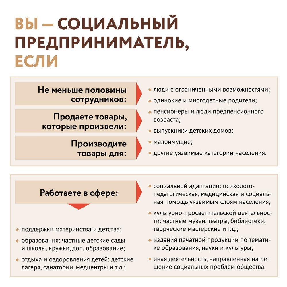 Критерии, по которым бизнесу может быть присвоен статус «социального», определены Приказом Минэкономразвития России от 29.11.2019 N 773 «Об утверждении Порядка признания субъекта малого или среднего предпринимательства социальным предприятием и Порядка формирования перечня субъектов малого и среднего предпринимательства, имеющих статус социального предприятия».