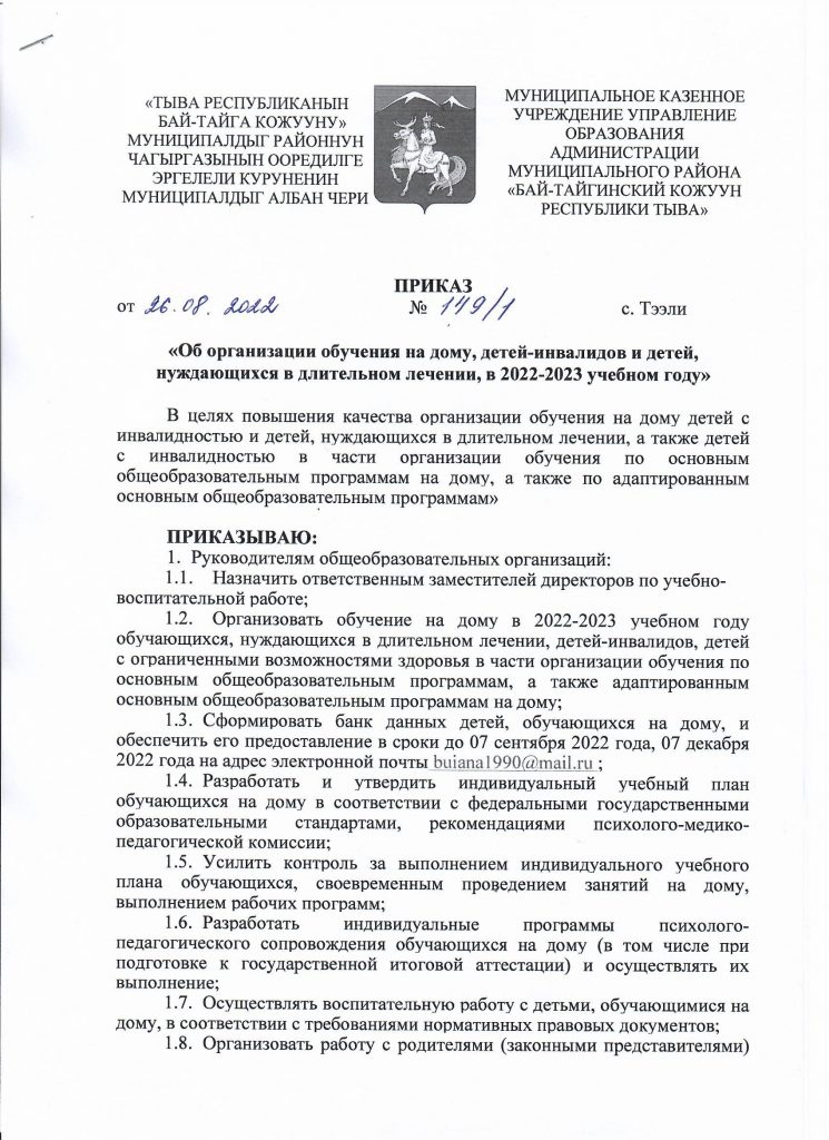Приказ об организации обучения на дому, детей-инвалидов и детей, нуждающихся в длительном лечении на 22-23г.