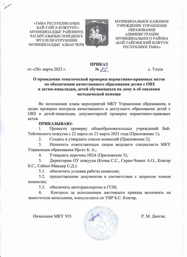 Приказ об оказании методической помощи и проверке по организации детей с ОВЗ.